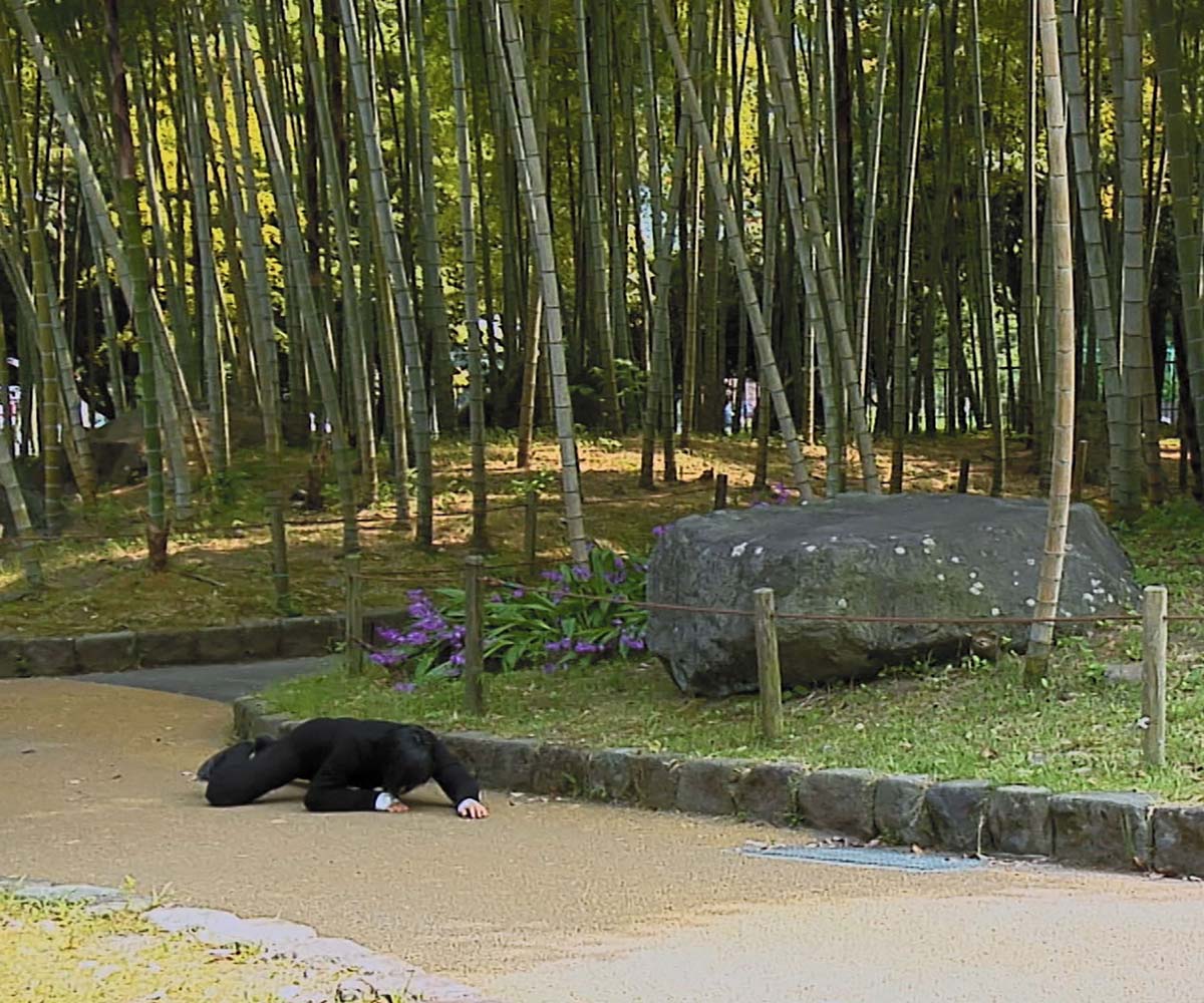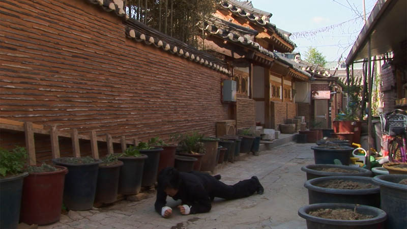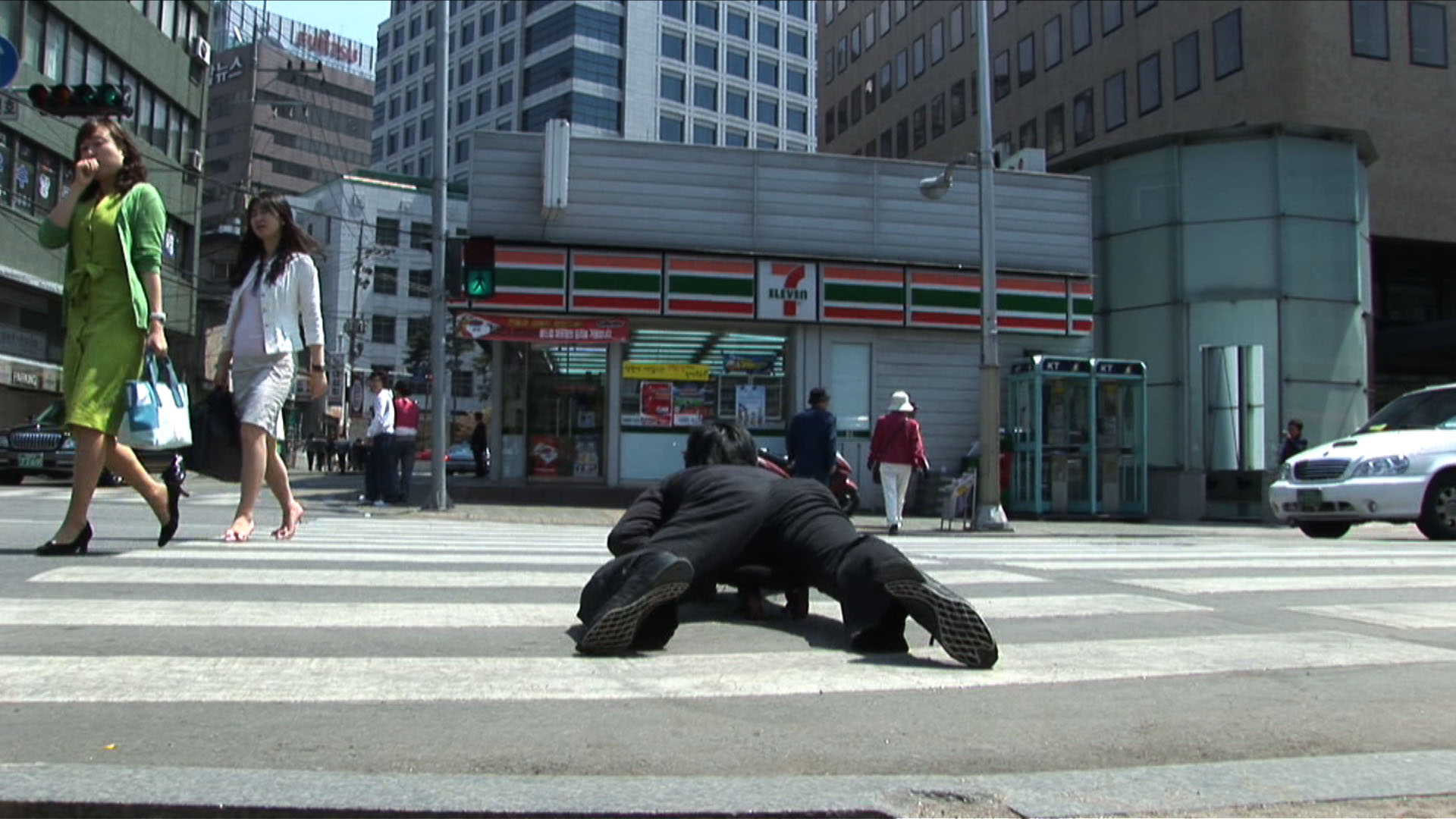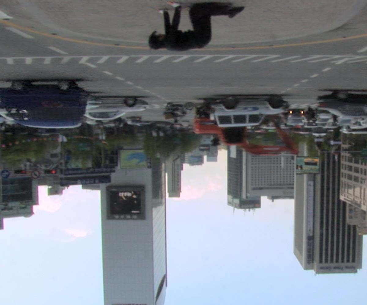 The dreaming collective knows no history (U.S. Embassy to Japanese Embassy, Seoul) extends Yoon's interest in the interrelationship between the built environment of the city, history and the body. The first part of the title makes reference to Walter Benjamin’s suggestion that modernity and the flows of history are phantasmagoric. The second part of the title refers to the performance for the video on the street moving from the U.S. Embassy to the Japanese Embassy in Seoul. Formally tipping the vertical city of skyscrapers and bipedal humans onto a horizontal plane, alludes to the simultaneously submissive and subversive possibilities of this inversion. Rife in historical and contemporary references and associations, the smooth flows of progress and power as well as the frantic pace of production and consumption are interrupted.