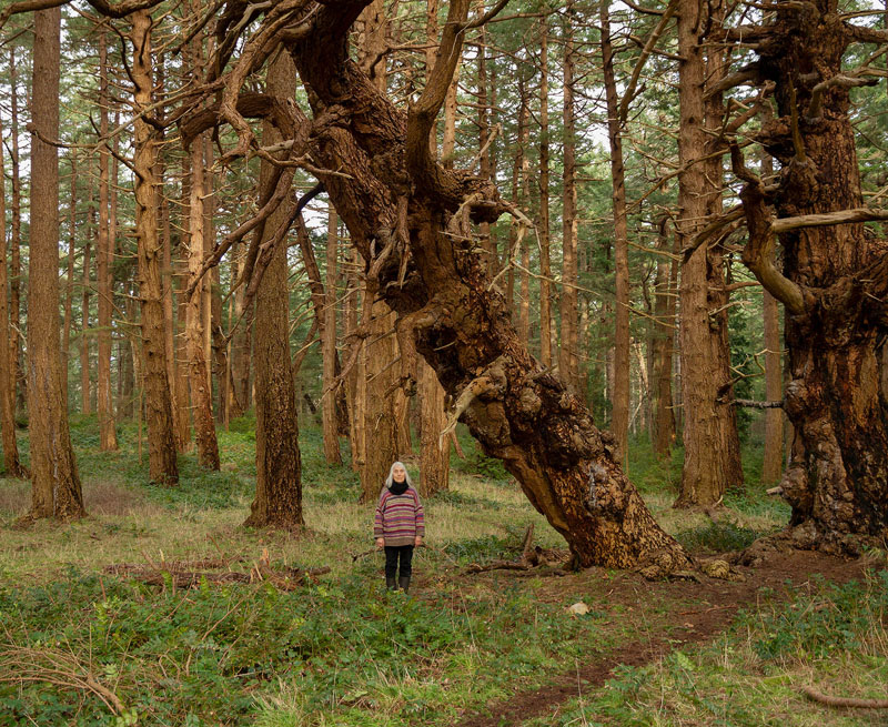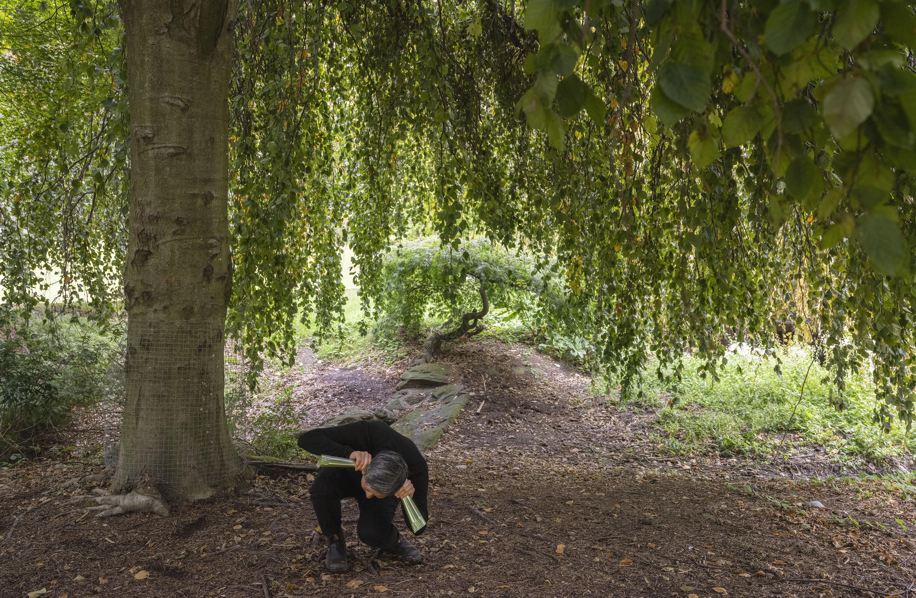 This work expresses her direct learning of these histories, both politically and aesthetically: “to embody land acknowledgements is to listen, to look differently.” In Longer View the artist replaces binoculars, an apparatus of ocular enhancement with a prosthetic prop that alludes to other ways of seeing, ways that for Yoon are linked to listening. Attunement Above and Below is a diptych. One image is of a microphone placed in front of a large Weeping Beech, a tree of European origin with networks below the earth. The second image is of the artist squatting using the same prosthetic prop – this time held up to her ears in what seems to be an absurdist dadaist gesture – listening to the ground suggesting the importance of being attuned to both the immediately visible as well as the invisible lying beneath the surface.