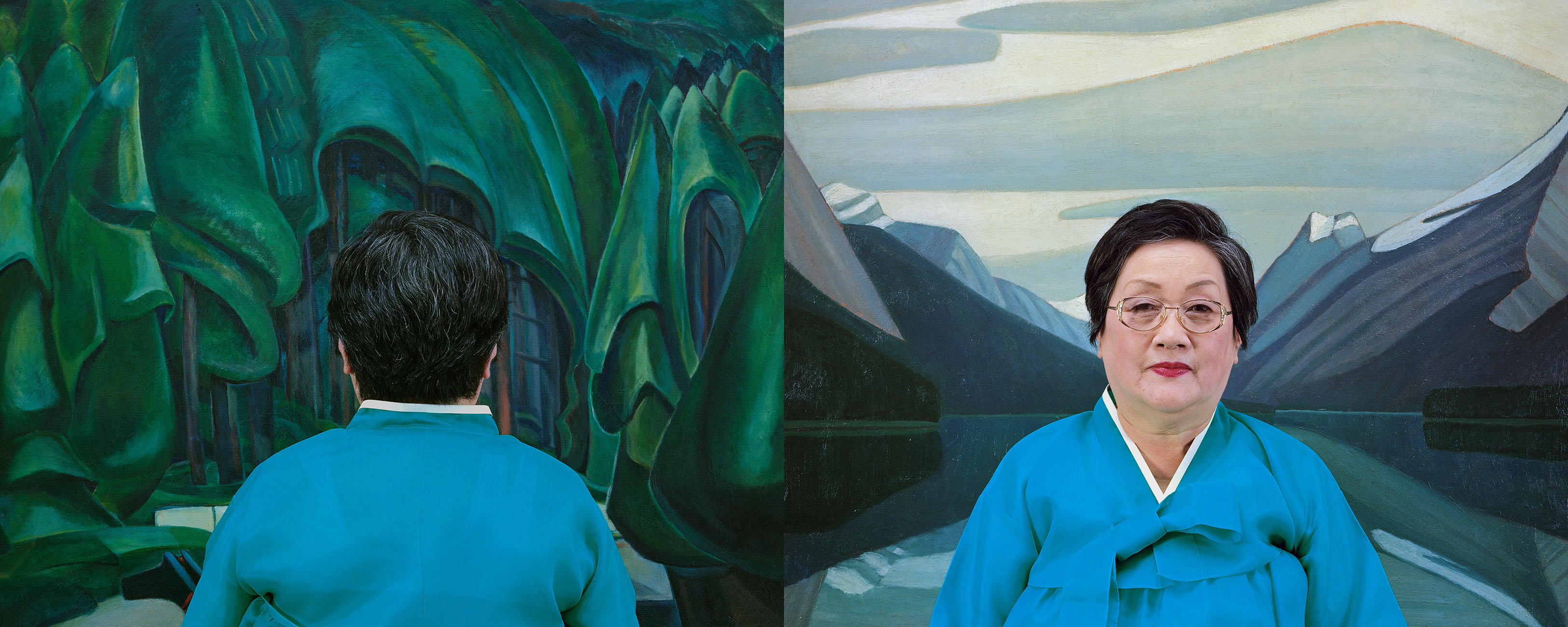 Perhaps Yoon’s most iconic work, A Group of Sixty-Seven established Yoon’s position as a Vancouver photographer making conceptual interventions into the History of Art and representations of the nation. For this work, Yoon invited 67 members of the Korean-Canadian community to 3 separate Korean dinners at the Vancouver Art Gallery exhibition Art for a Nation. During that dinner, Yoon’s first experiment at the borderlands of conceptual photography and social practice, Yoon led a discussion about experiences of racism in Canada, and symbolically took formal portraits of all participants against two monuments of Canadian landscape painting in the VAG’s collection: Lawren Harris, Maligne Lake, Jasper Park (1924), and Emily Carr, Old Time Coastal Village (1924-30). Through these obviously constructed photographs (signalled through formal repetition), Yoon denaturalizes Harris and Carr’s colonial gazes on the landscape, the assumed disjuncture between immigrants of colour and that landscape, as well as the presumed documentary nature of the photograph itself. 1967 marked 100 years of confederation and the year restrictions were lifted on East Asian immigration to Canada.