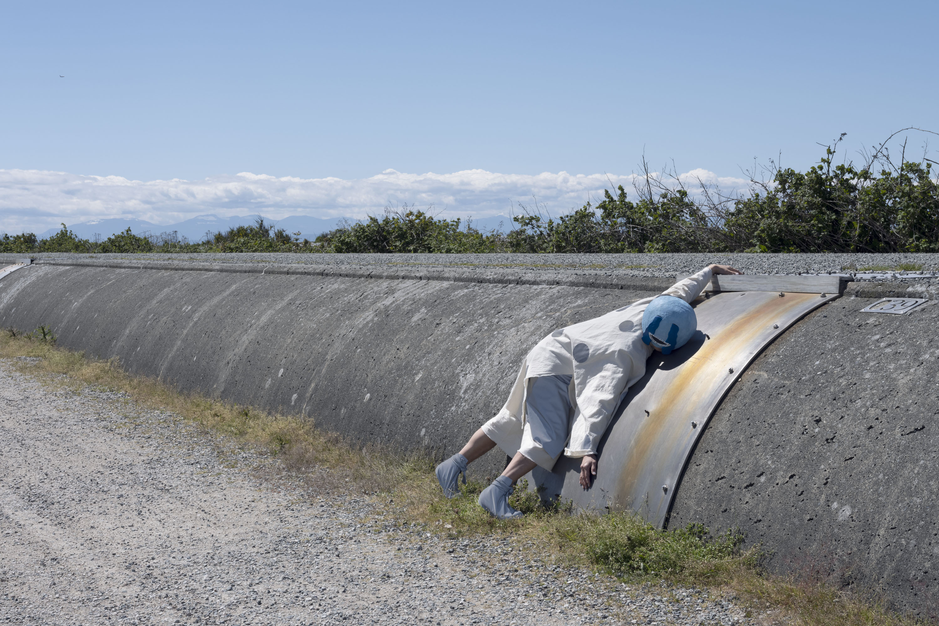 talchum, traditional Korean dances that tell stories of social rebellion against a dominant order. Through their saturated colour and exaggerated expressions, the masks express an extreme intensity, while the figure wearing them adopts casual poses as if this intensity is the most natural thing in the world. In a costume made of space-age fabric appliquéd onto unbleached cotton, the figure appears in different masks on and around a seven-and-a-half-kilometre sewage pipe hidden within a jetty extending off BC’s Iona Island.