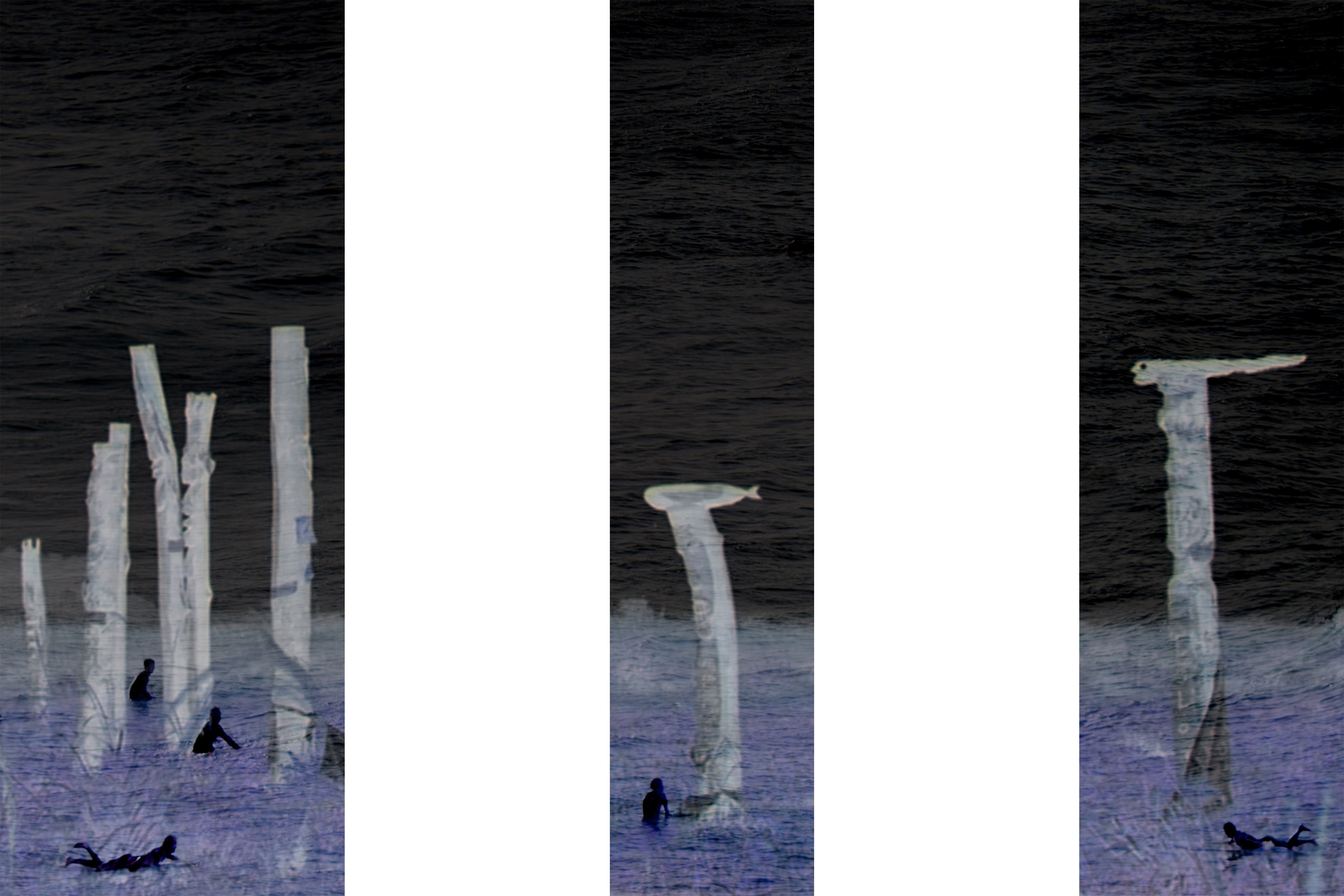 Still So (Mul Maeum) is comprised of nine scroll-like prints depicting jangseungs (Korean totem poles). These poles were made by activists resisting the building of the world’s longest seawall in Saemangum, which disrupted a major estuarine tidal flat, destroying the natural habitat for migratory birds. Located in Jin-me Yoon’s ancestral province, this seawall—stretching along South Korea’s southwest coast—dried out the land, endangered birds and displaced whole fishing communities. The jangseungs stand tall: raised by the activists as reminders of the once life-sustaining estuary, buried over by the Saemangum reclamation project. Here, in their haunted form as negative images, they now mark the loss of one of Asia’s most important wetlands and all that is lost along with it.