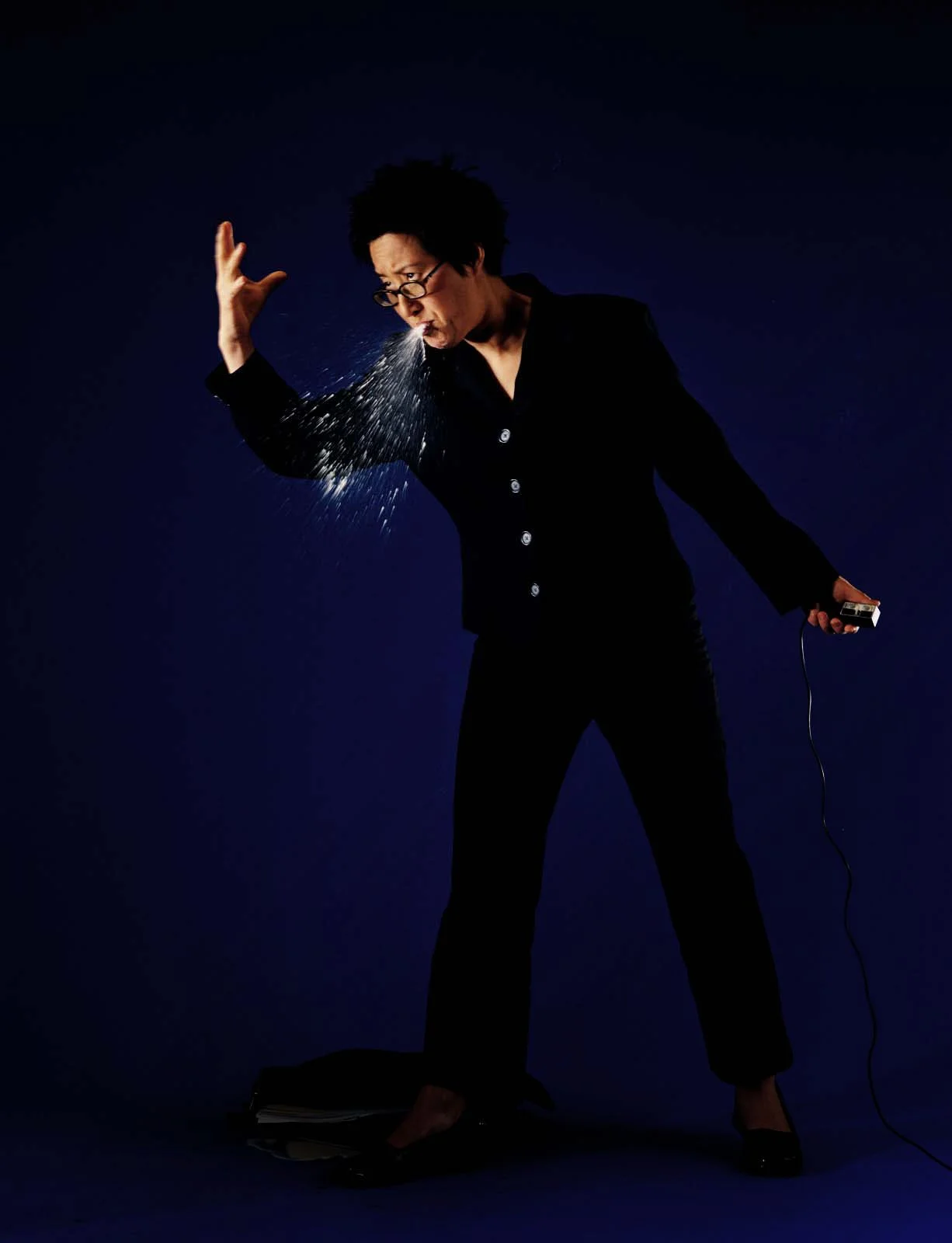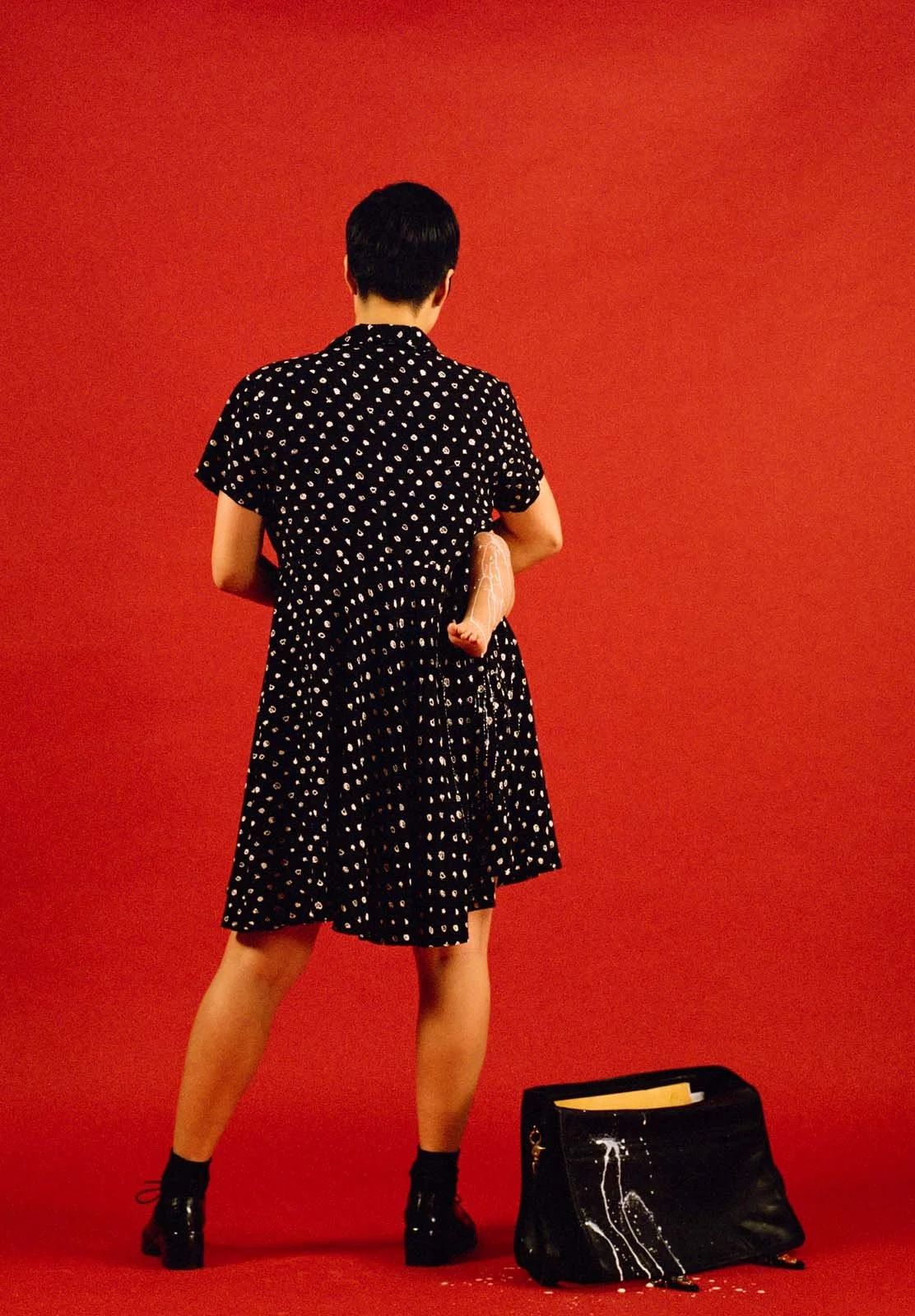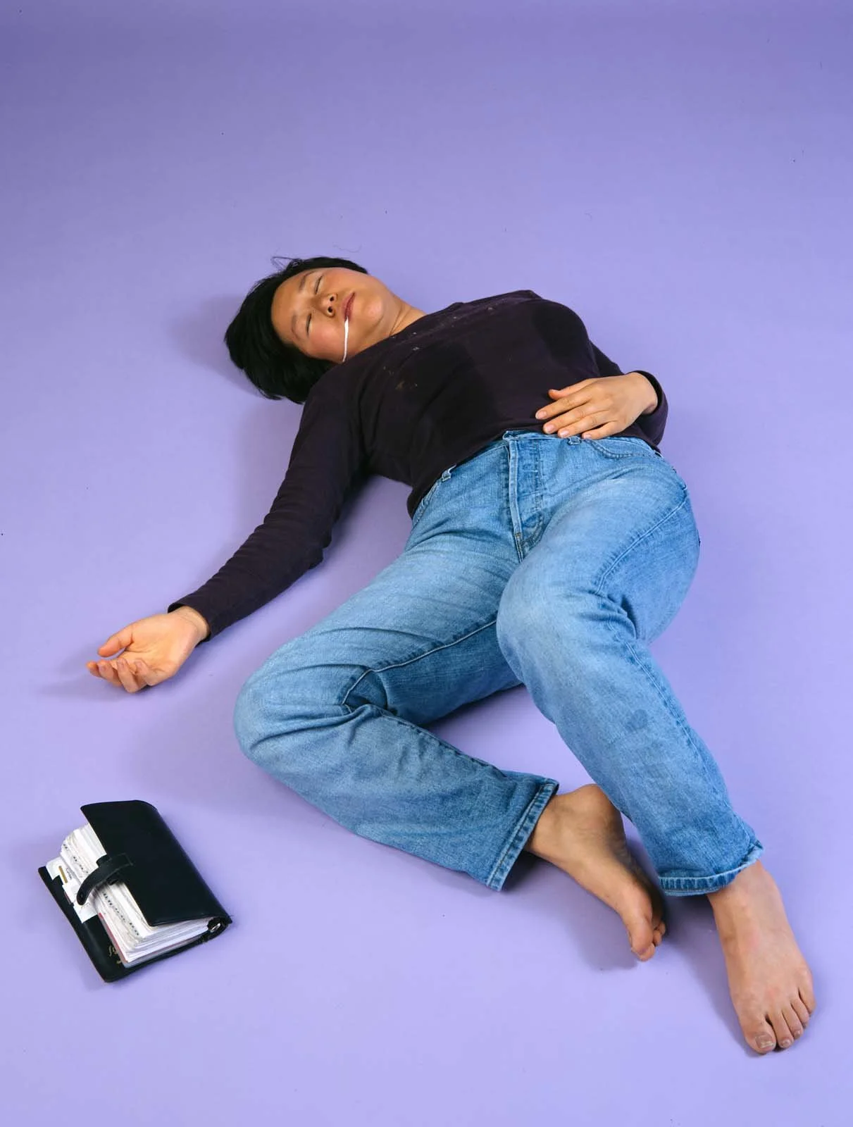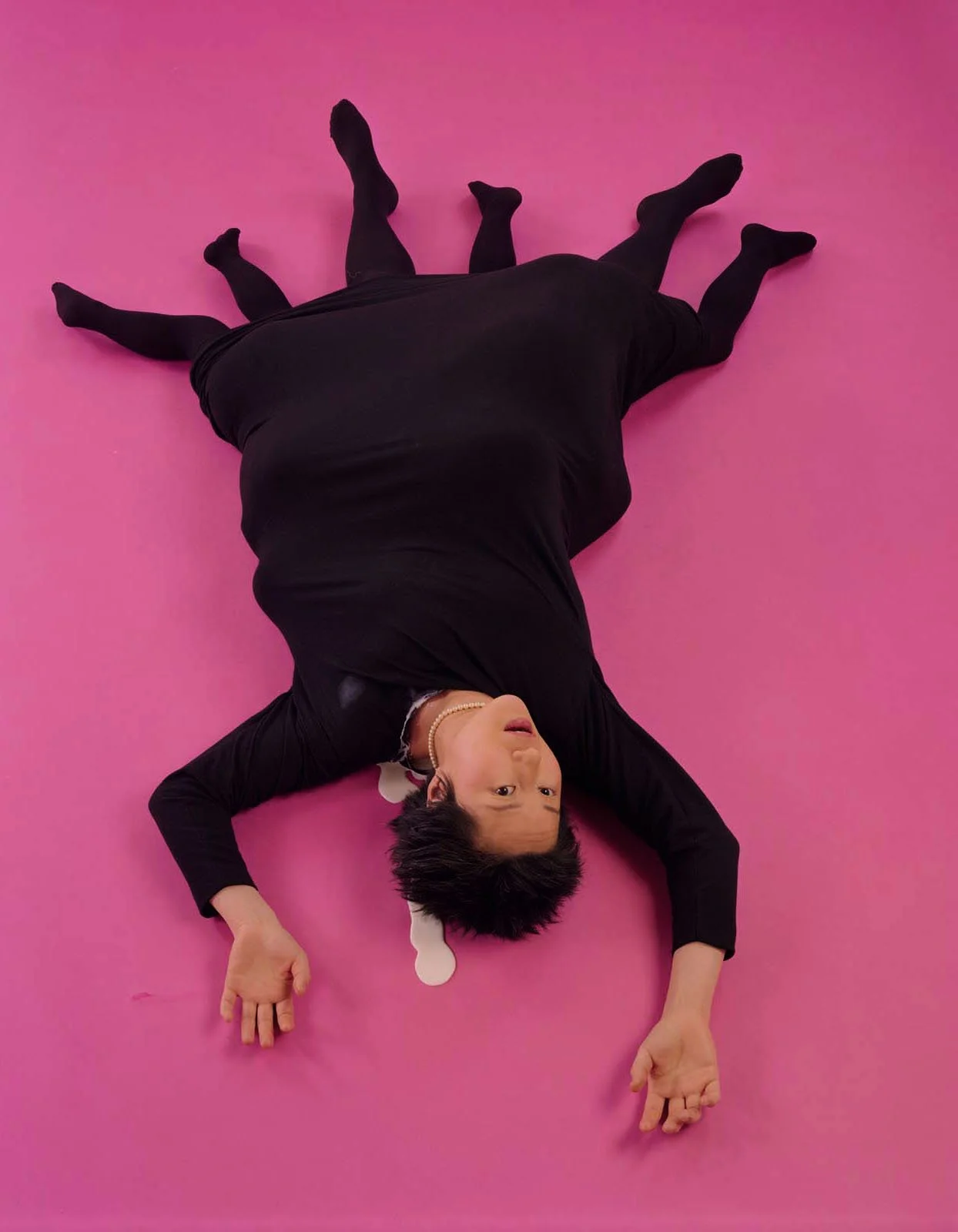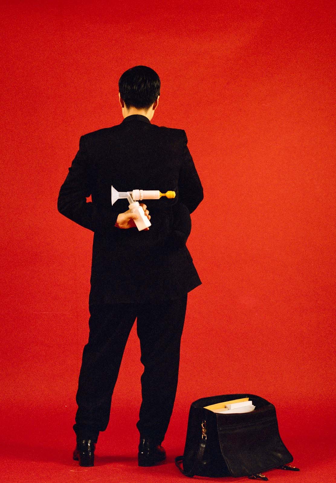 Yoon interrogates the maternal subject in this series, which will especially resonate well with mothers balancing work and child care in the midst of a pandemic. Set against richly coloured backgrounds that refer to advertising, Yoon’s use of “blatant artifice” addresses an important early context for her work—Vancouver photoconceptualism. Critically engaging with other predominantly masculinist practices—Abstract Expressionist drip painting, post-Duchampian practices and performance through a nod to Bruce Nauman’s Self Portrait as Fountain (1966)—Yoon asks: Can artist be both culturally productive and biologically reproductive? Can a racialized, feminist subject be an art historical subject?