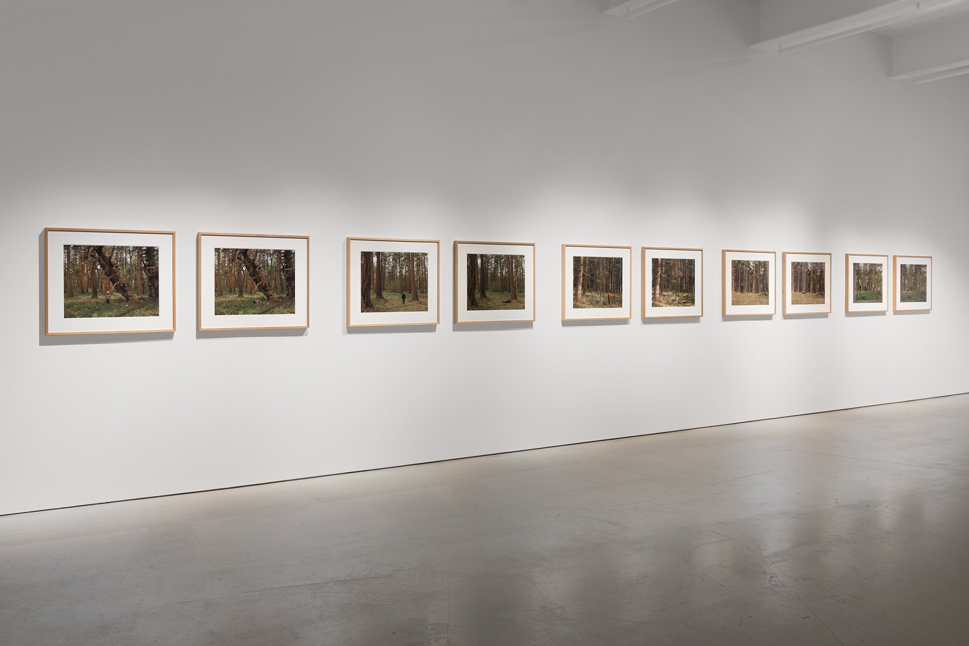 While the video marks time on a human level—psychically and affectively—the photographs convey it geologically. Here, photography is used to register human life in an instant. In the Living Time photographs the six diptychs portray each character as resilient yet fragile, connected yet displaced—shadowed within the landscape. Framing the lush West Coast setting with its immense trees featured prominently in each image, Jin-me Yoon presents the environment as something to be respected and revered.