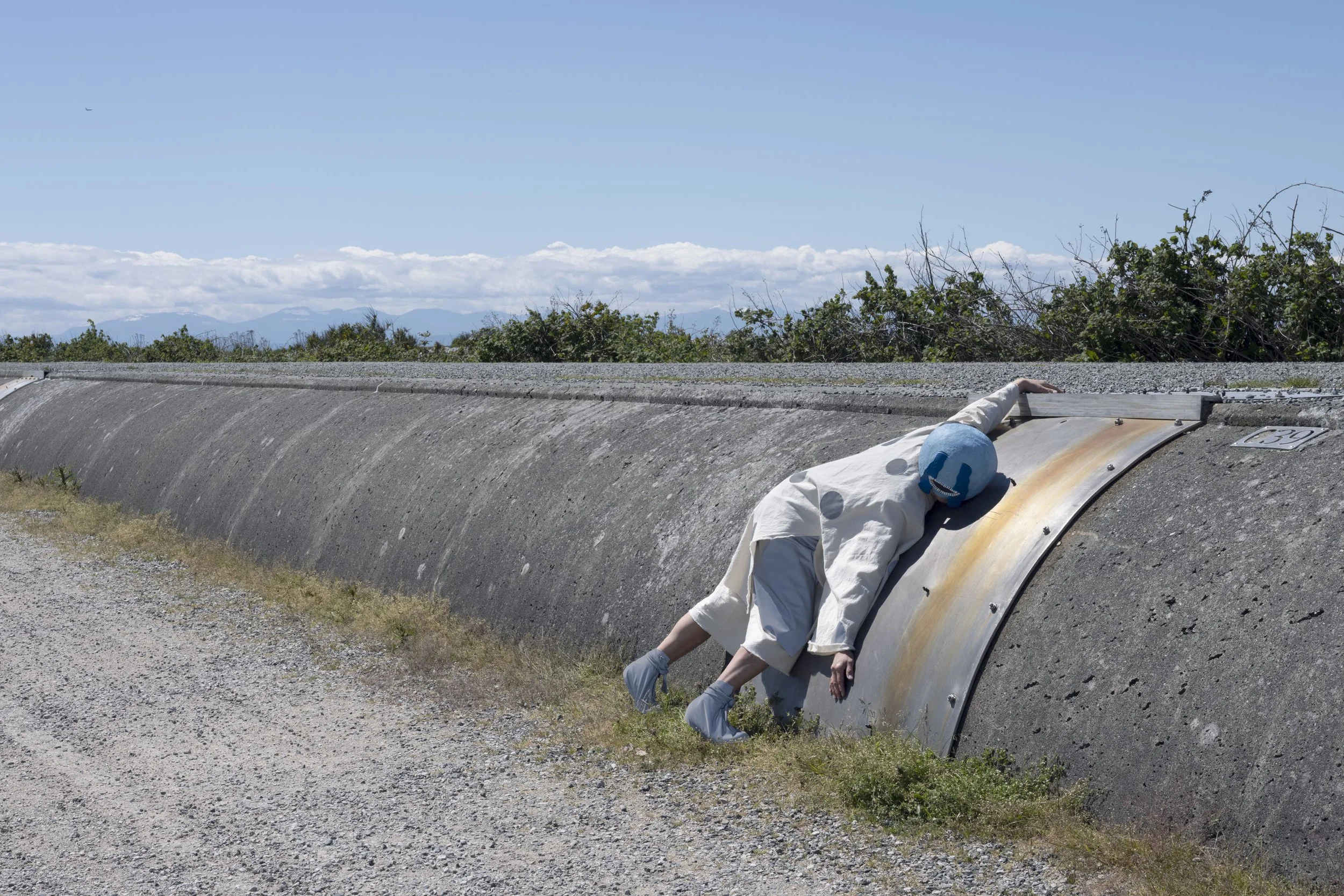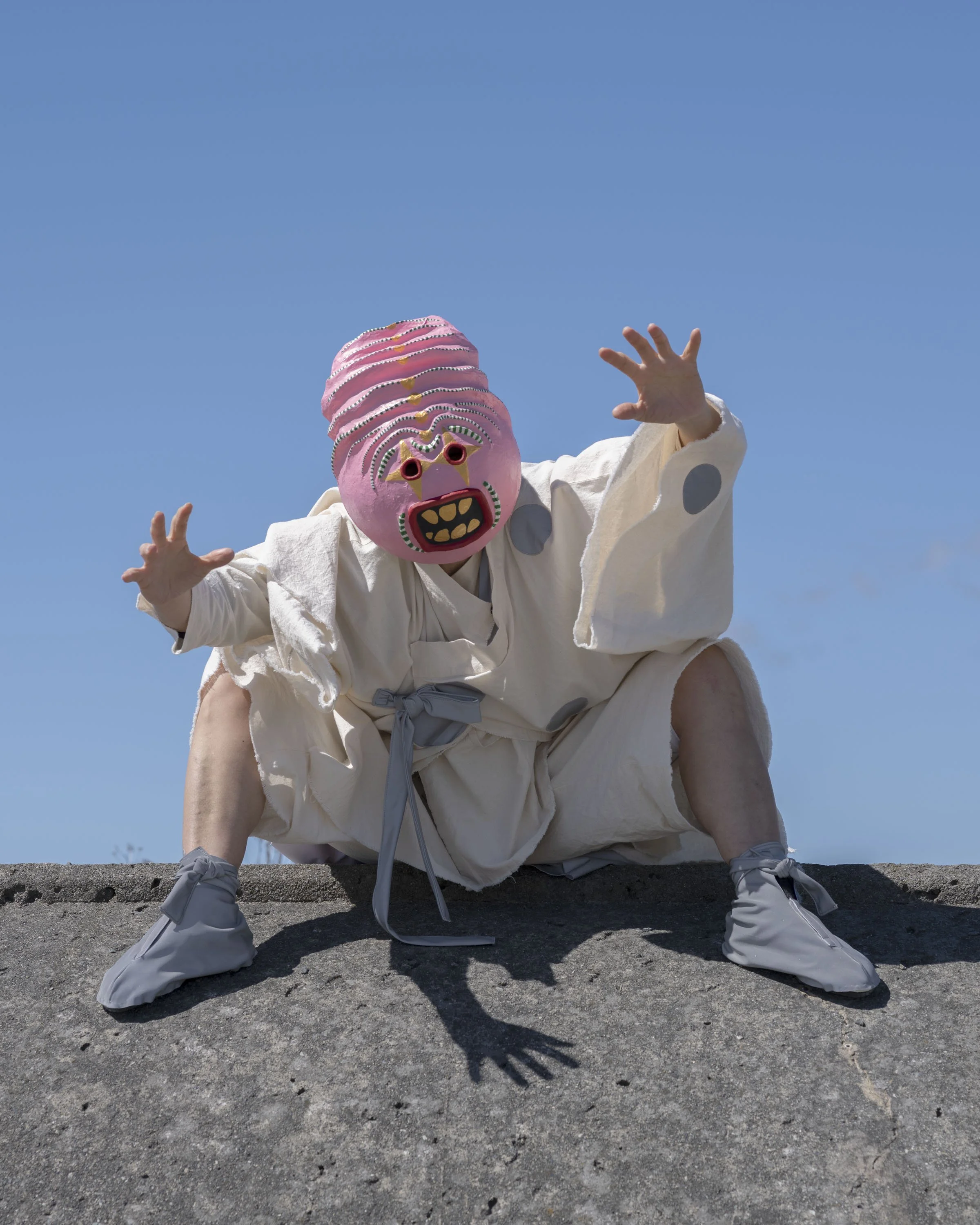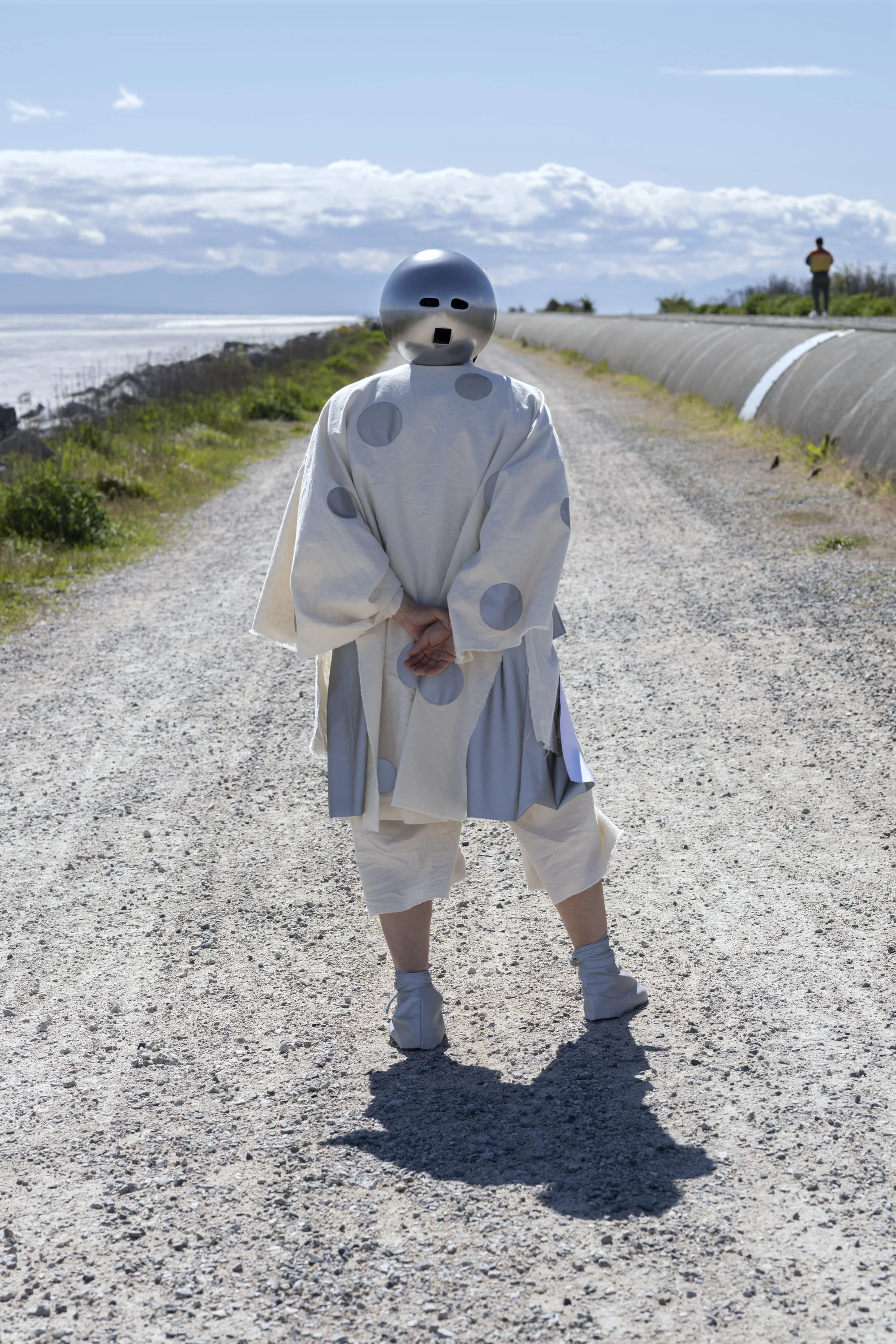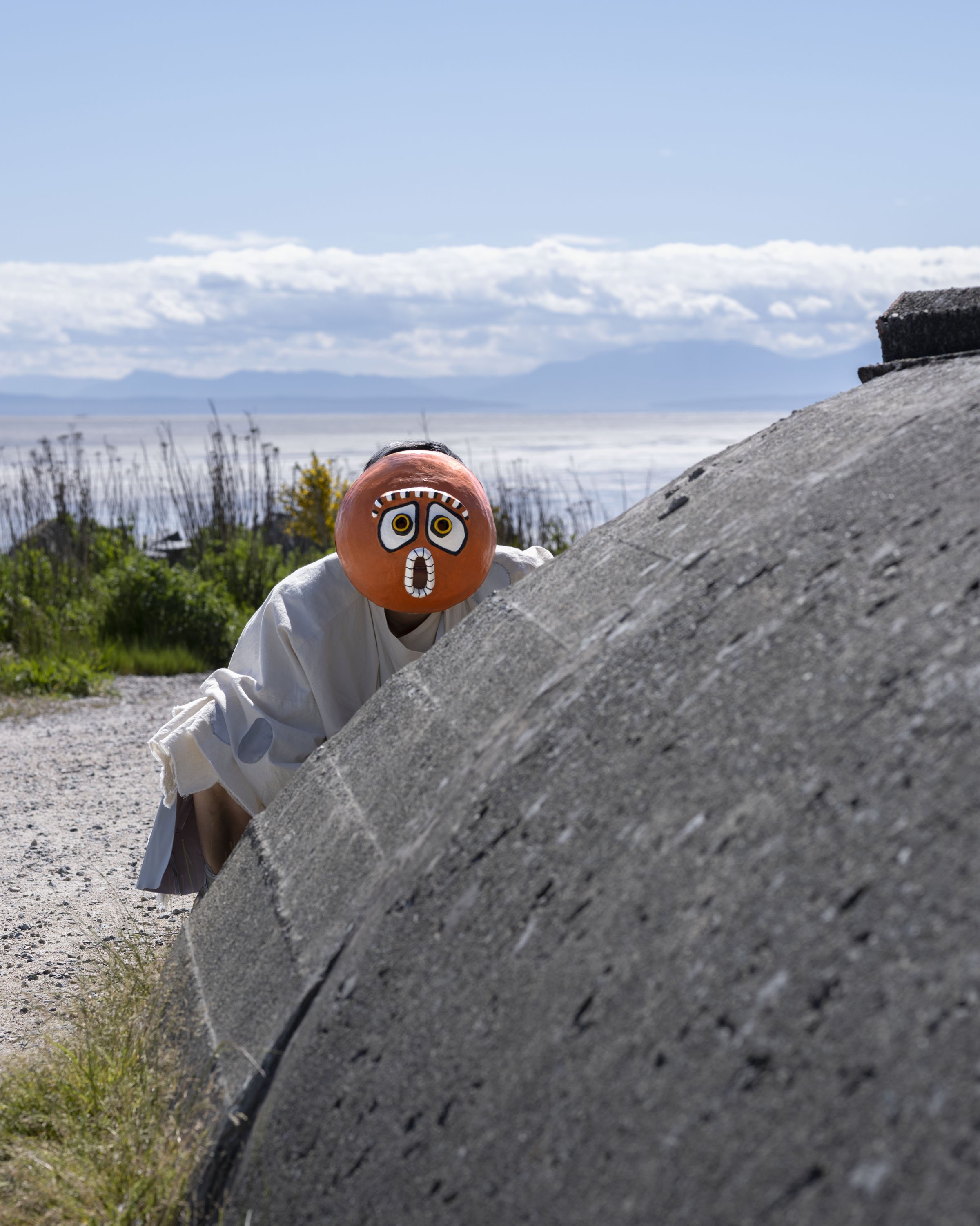 Bringing together the pre-modern and the futuristic, Long Time So Long’s masks mash up the ubiquitous emojis we use to set the tone of our digital relationships and characters from talchum, traditional Korean dances that tell stories of social rebellion against a dominant order. Through their saturated colour and exaggerated expressions, the masks express an extreme intensity, while the figure wearing them adopts casual poses as if this intensity is the most natural thing in the world. In a costume made of space-age fabric appliquéd onto unbleached cotton, the figure appears in different masks on and around a seven-and-a-half-kilometre sewage pipe hidden within a jetty extending off BC’s Iona Island.